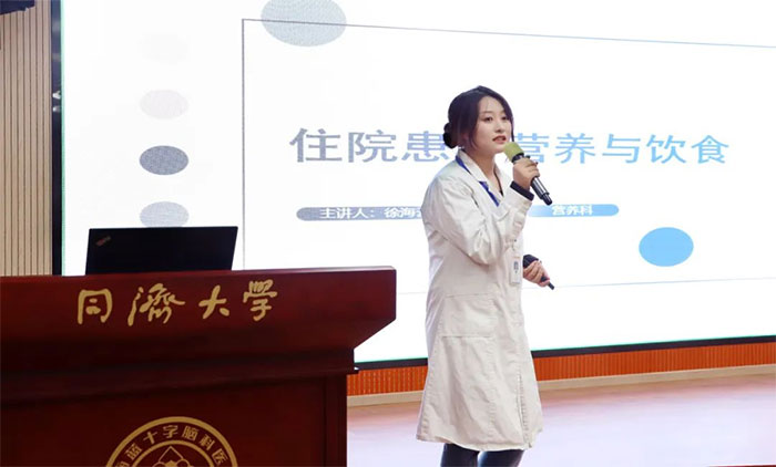 营养师徐海云从“住院患者营养筛查方法、三大供能营养素、特殊限制蛋白质的摄入情况以及肠内营养和肠外营养”等几大方面为大家介绍了住院患者营养饮食方面的注意事项。指出如何根据不同患者的病例情况为患者补充膳食营养,做到膳食均衡,助力患者身体机能的恢复。