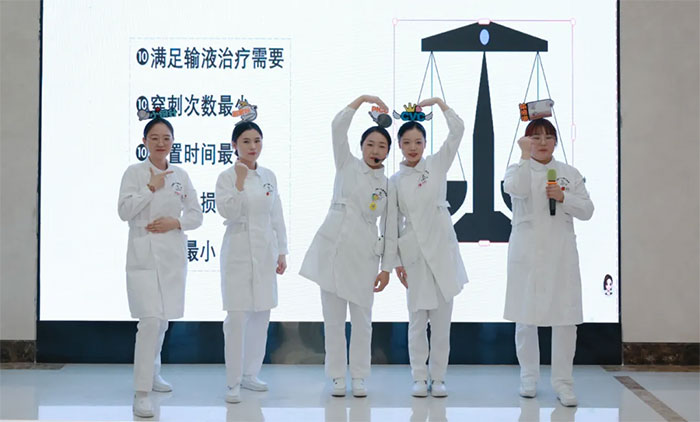 小钢针擅长‘闪电战’;留置针是负责“短期阵地战”的;PICC/CVC是负责“中长期战役”的;输液港则是负责“持久战”和“特种作战”的……选择何种置管方式,需要根据患者的治疗时间、药液性质、血管条件、生活需求和经济情况来综合决定。黄朵朵护士长带领着静疗小组成员钱世平、蔡先杰、刘文、张雨晴、裴育,通过精心设计的卡通形象和活泼的语言,结合丰富的图片、生动的视频及真实贴切的案例,将专业性很强的静疗护理知识,演绎得生动形象、惟妙惟肖。