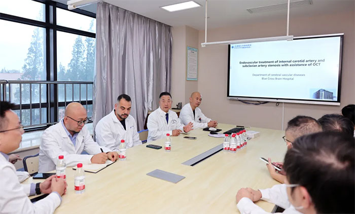 Tareq Kass-Hout副教授在潘耀良副院长陪同下,深入4F脑血管病科,围绕一例复杂的“颈内动脉合并锁骨下动脉狭窄”病例,与科室团队进行了深入讨论。双方重点探讨了OCT(光学相干断层成像)这一前沿血管内影像技术在术前评估、术中支架选型与放置、以及术后效果评价中的关键作用。Tareq Kass-Hout副教授对蓝十字能够熟练运用OCT技术处理复杂病变表示赞赏,并结合该病例与与席刚明教授、王贵平博士团队就抗血小板治疗策略调整、栓塞保护方案优化、不同介入路径(如桡动脉)的器械选择等临床难点展开交流。这场基于真实病例的深度对话,超越技术展示层面,直击临床决策核心,充分体现双方合作的务实与高效,也为未来在脑血管介入领域的联合研究与技术提升开辟了新路径。