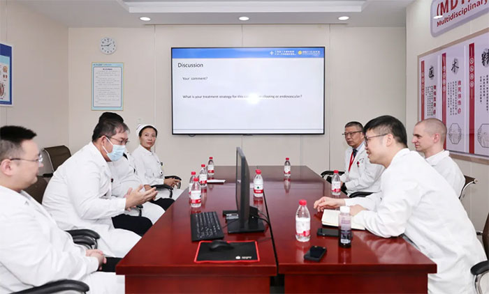 在周克祥副院长陪同下,David Satzer博士与6B神经外二科卢云鹤博士团队开展病例讨论。卢云鹤博士以流利英文主持,双方就大脑中动脉分叉部动脉瘤的治疗策略进行交流。David Satzer博士介绍了美国基于指南的外科手术主流方式,并对蓝十字开展的血流导向装置、WEB扰流装置等介入技术表示肯定。此外,双方还就脑转移瘤综合治疗、强迫症外科手术的伦理法律差异等议题展开探讨。卢云鹤博士重点介绍了医院在脑机接口领域的临床应用,特别是对昏迷患者进行意识评估及脊髓电刺激促醒的实践成果,引起David Satzer博士浓厚兴趣。双方讨论持续两个半小时,意犹未尽,并互换联系方式,期待在学科建设与科研合作方面持续推进。
