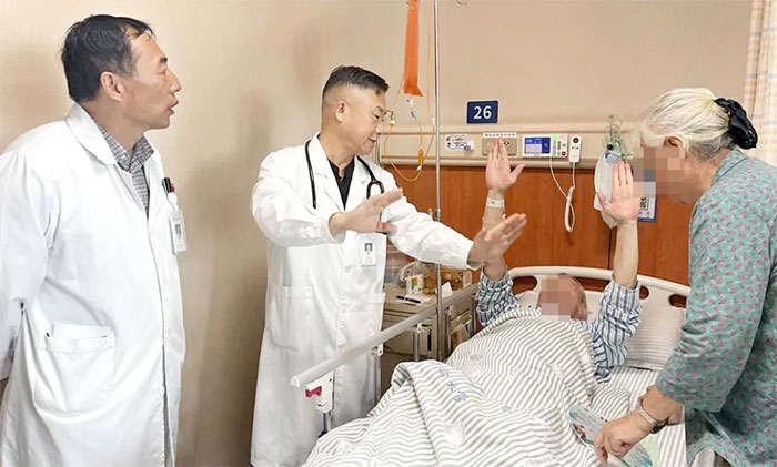 目前,经过进一步对症及改善脑血循环治疗,郑先生正在康复中。医院学术副院长兼4F脑血管病科主任席刚明教授和刘占卿主任为患者查体,其右手活动能力已基本恢复正常。