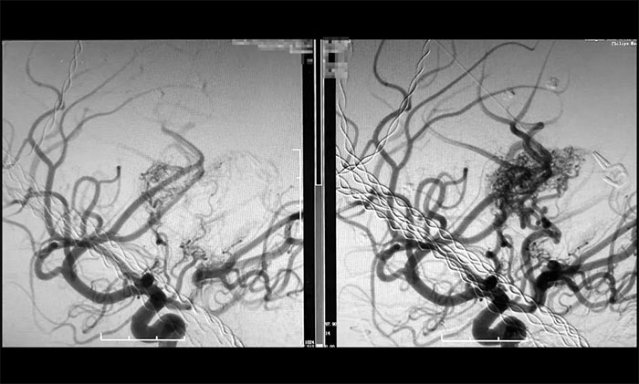 ▲ 巨大脑动静脉畸形(右)被顺利栓塞(左)