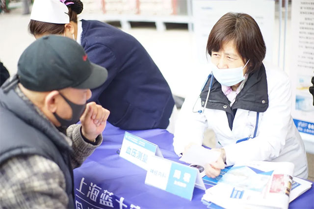 上海蓝十字脑科医院神经内科5B病区主任余志良、3A病区医生蔡振丽、护士冯梦婷及龙妙等组成的志愿医疗队早早来到活动现场,为居民提供健康信息服务、血压测量等专业而暖心的便民医疗服务。
