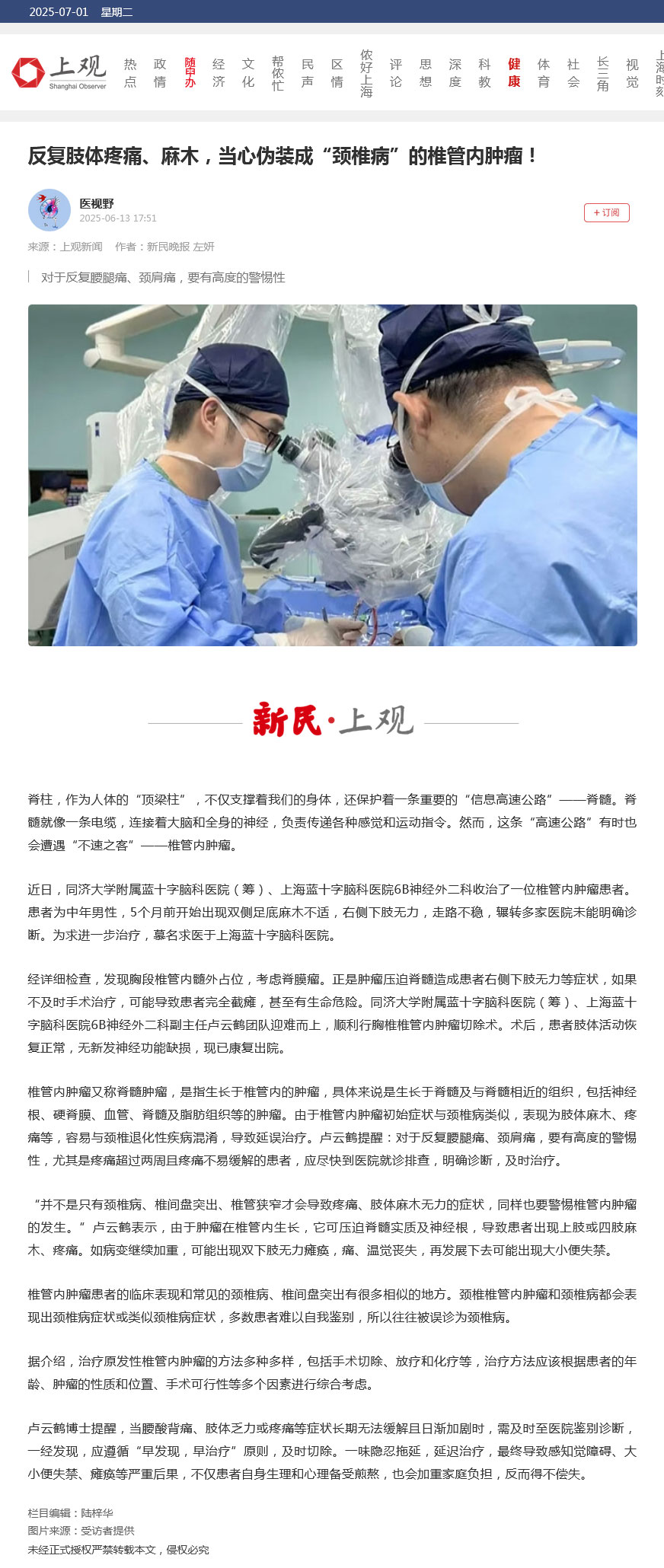 椎管内肿瘤又称脊髓肿瘤,是指生长于椎管内的肿瘤,具体来说是生长于脊髓及与脊髓相近的组织,包括神经根、硬脊膜、血管、脊髓及脂肪组织等的肿瘤。由于椎管内肿瘤初始症状与颈椎病类似,表现为肢体麻木、疼痛等,容易与颈椎退化性疾病混淆,导致延误治疗。卢云鹤提醒:对于反复腰腿痛、颈肩痛,要有高度的警惕性,尤其是疼痛超过两周且疼痛不易缓解的患者,应尽快到医院就诊排查,明确诊断,及时治疗。