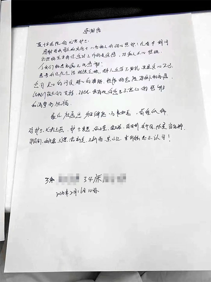 此外,还有更多医护“轻易/轻伤不下火线,始终坚守岗位”,如7B马娜等医生连续值班,下夜班后也依旧在岗;因兄长新年,殷昌凤主任匆忙返回老家后,初四便返岗;护士谢童童、董梓一等高烧,毅然坚持在岗;护士崔慧慧夜班后仍坚持在岗。以及5B病区雷蕾医生、黄秀娟医生、左宗耀医生等以敬业、奉献等获得好评。大年三十,雷蕾医生因精心治疗和敬业精神,收到患者3000元红包,婉拒无果后,将“红包”充进患者住院账户。左宗耀医生初四返岗,因耐心负责,和护士刘文一同收到患者感谢信。