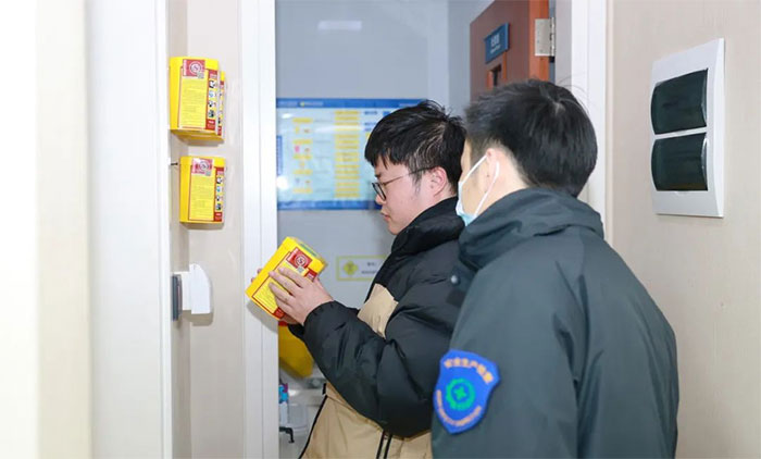 随后,检查组来到7B病区,重点检查病区危险化学品的管理和存放,过滤式消防自救呼吸器是否可正常使用,并通过随机访谈,检查医护人员对消防应急救援知识的掌握程度。