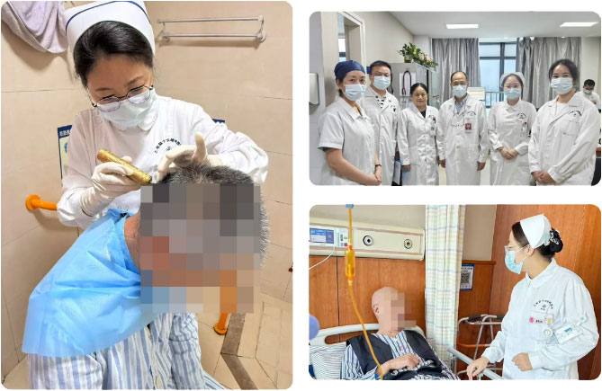 为降低误吸风险,在6B神经外二科副主任卢云鹤博士支持下,吴锦护士长与B超声科李玉龙主任团队先后为5位患者更换鼻肠管,并为4A病区患者完成一例置管。